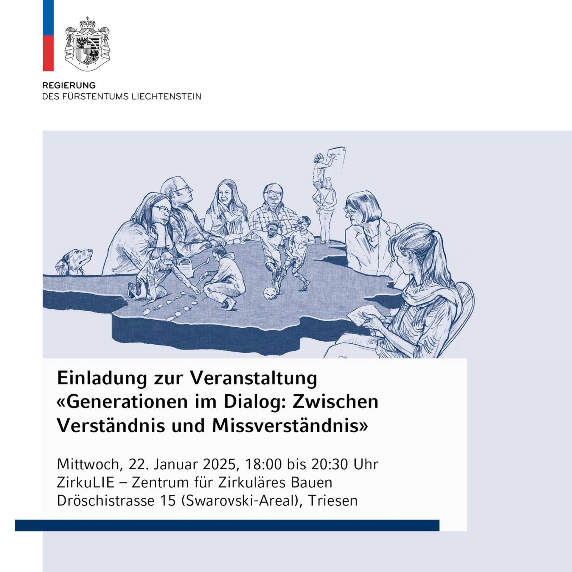 Die Regierung des Fürstentums Liechtenstein lädt am Mittwoch, 22. Januar 2025 um 18 Uhr zur generationenübergreifenden Diskussion ein. Ziel der Veranstaltung ist es, im Rahmen der Umsetzung der Altersstrategie den sozialen Austausch und die Diskussion zwischen Jung und Alt im Sinne eines "Gesellschaftsdialogs" zu fördern.